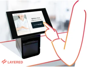 レイヤードの無人受付ソリューションは、来院後、受付スタッフの対応なしに患者がタブレット端末を操作するだけで受付を完了できる仕組みです。