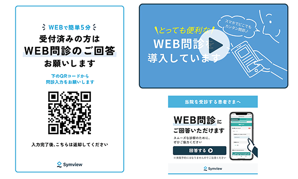 WEBページやQRコード、デジタルサイネージ用動画など、患者にWEB問診を周知するツールをご用意しています。WEB問診への動線をスムーズにし入力率向上につながります。