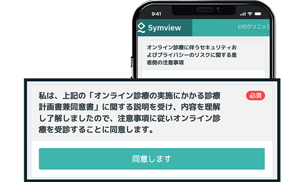 オンライン診療を初めて受ける患者には診療計画を作成し、患者の合意を得る必要がありますが、シムビューではWEB問診内で合意形成をするための項目を設定することができます。オンライン診療をはじめられる際には適切な問診内容をご提案をさせていただきます。