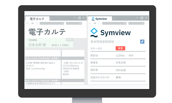 WEB問診シムビューは各電子カルテメーカと正式に連携調整を行っており、電子カルテ端末でご利用いただくことが可能です。(オンプレ型電子カルテ含む)Symviewオンライン診療も電子カルテ端末に同居が可能です。複数のPCをご用意いただく必要はございません。(事前に設定が必要です)