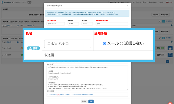 ビデオ通話の予定はWEB問診の回答有無に関わらず作成できます。通知はシムビュー画面内でメールまたはSMSで送信できます。