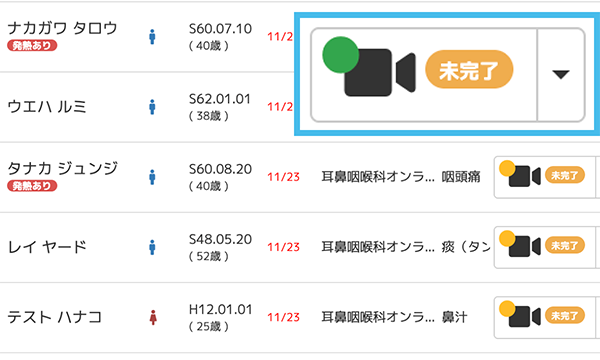 シムビューの一覧画面で患者がビデオ通話URLに入室しているかどうかを確認できます。
