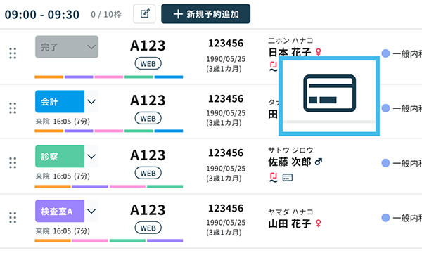 予約システムと連携することで、予約・問診・診察の一連の患者動線をオンラインで対応可能です。さらに、レイヤードの予約システムなら決済まで対応し、予約から決済までスムーズな動線設計に役立ちます。
