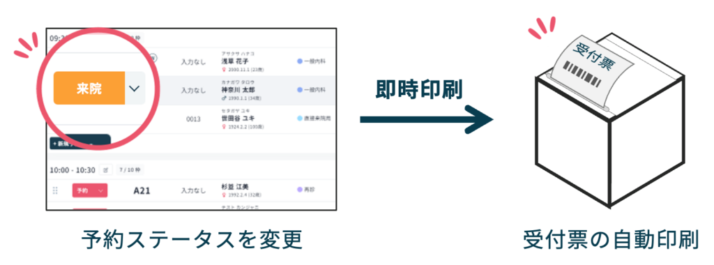 - ステータス変更に応じてレシートプリンターから自動で受付票が印刷されます