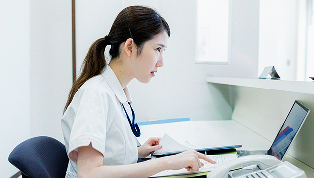 受付端末を通じて、初診情報や保険証確認を患者自身が入力。スタッフは確認業務に専念でき、受付全体の効率化につながります。