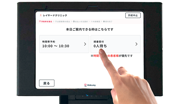 ワクミー上の当日案内可能な枠が表示され、希望の時間帯予約または順番受付を選択します。
