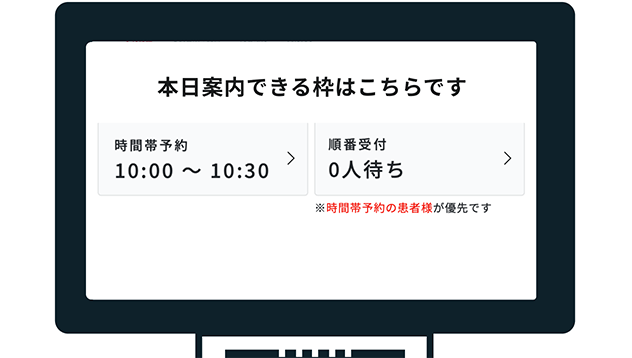 無人受付は当日の空き枠に患者を自動で案内できるため、スタッフが割り振りや調整を行う手間を最小限にし、受付がスムーズになります。