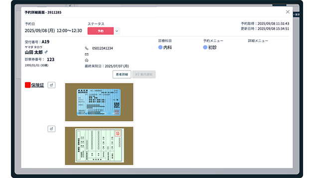 予約詳細画面から患者の受付情報を確認します。保険証や医療証なども確認可能です。