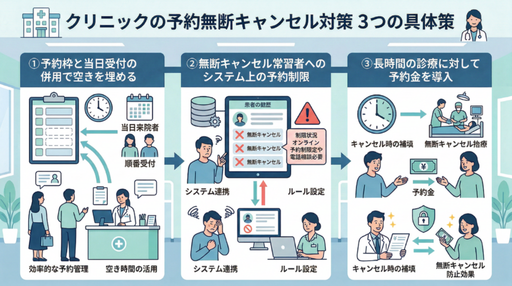 1回で制限するのか、2回目以降にするのかといった基準はクリニックごとに検討が必要ですが、ルールを明文化しシステムに組み込むことで、徐々に抑止効果を高めることが期待できます。