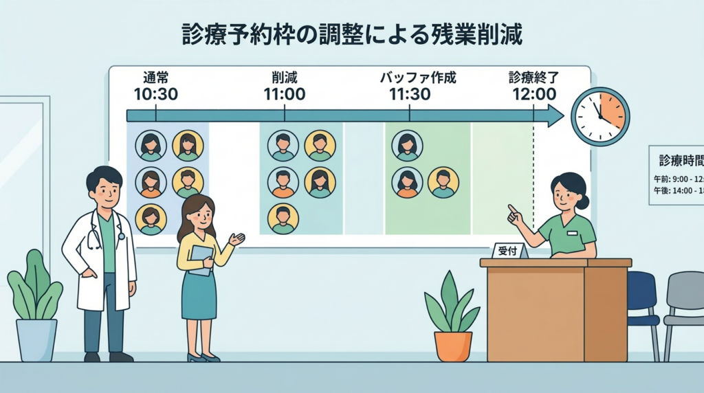 残業を減らすためには、まず予約枠の設計を見直すことが有効です。例えば午前診療が12時終了の場合、11時以降の予約枠を通常通りの人数で受け続けるのではなく、段階的に枠数を減らしていく方法があります。