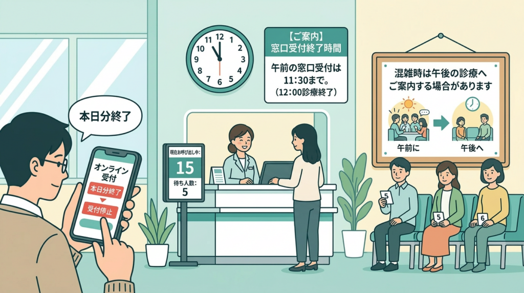 さらに、ホームページや院内掲示で「待ち状況によっては受付時間内でも対応できない場合があり、午後診療へご案内することがあります」といった事前案内を行うことも有効です。あらかじめルールを明示しておくことで、現場の混乱やスタッフの心理的負担を軽減できます。