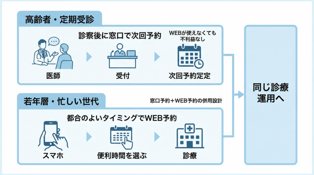 定期受診の高齢患者さんについては、窓口で次回の時間帯予約を取る運用を基本にすれば問題ありません。例えば診察後に「次は水曜日の10時に」とその場で予約を取っていただければ、WEBが使えないことによる不利益は生じません。一方で、若い患者さんは自分の都合のよいタイミングでWEB予約を活用できます。WEB予約はネットからしか予約できない仕組みではなく、院内予約と組み合わせて運用するものです。この併用設計ができていれば、高齢者を置き去りにすることなく、新しい患者層へのアプローチも可能になります。