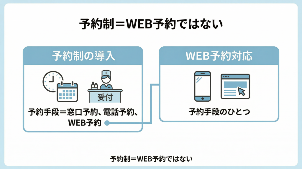 まず整理しておきたいのは、「予約制を導入すること」と「WEB予約に対応すること」はイコールではないという点です。時間帯予約という運用そのものは、患者さんにとってスケジュールが立てやすくなる仕組みであり、世代を問わず受け入れられやすいものです。そのうえで、その予約をWEBからも取れるようにするかどうかが次の論点になります。若い患者さんにとってはWEBから予約できることが利便性向上につながり、新規患者の獲得にも寄与しますが、それが直ちに高齢者の不利益になるわけではありません。まずはこの二つを切り分けて考えることが重要です。
