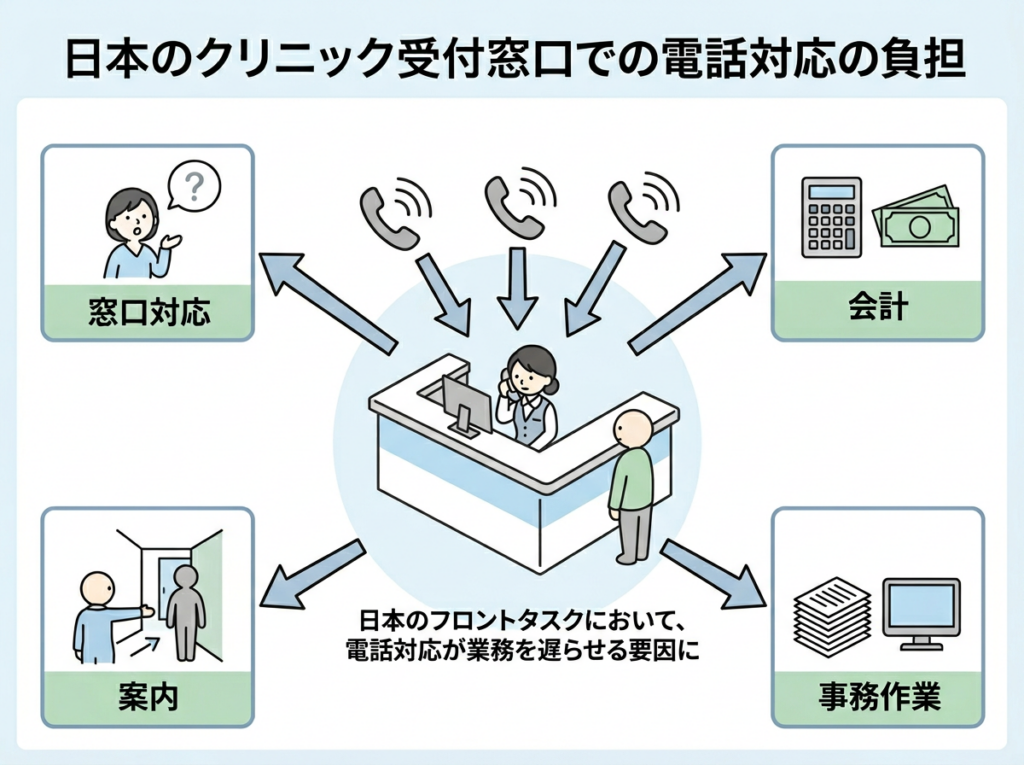「受付が常に電話対応に追われてしまい、本来の窓口業務が回らない」「スタッフの負担が大きく、他の業務に手が回らない」今回は、このようなご相談をいただきました。実際に多くのクリニックで、受付業務の忙しさの背景には“電話の多さ”が潜んでいます。では、この電話対応の負担はどのようにすれば減らすことができるのでしょうか。今回は、患者動線と業務設計の視点から、その具体策を整理します。(患者動線DXコンサルタント:石井聡)