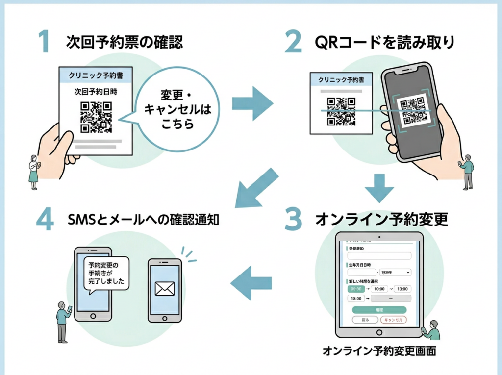 次回予約票にQRコードを印刷し、「変更・キャンセルはこちらから」と明示する仕組みは非常に有効です。