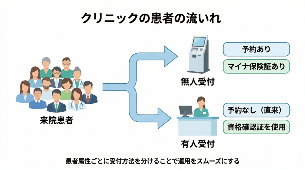 多くのクリニックで採用されているのは、「無人受付で対応できる患者をボリュームゾーンとして無人に集約し、イレギュラーなケースだけを有人受付で対応する」という運用です。