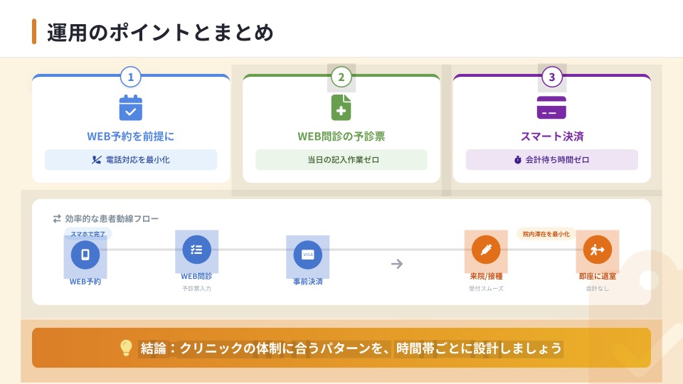 まずはWEB予約を前提に、どの時間帯でどのパターンを採用するのかを設計することが大切です。