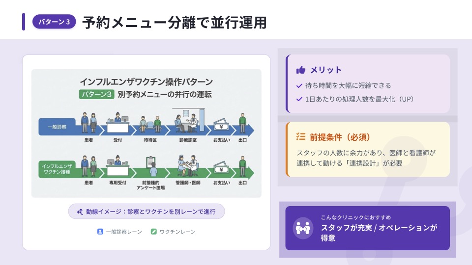 3つ目は、一般診療と同じ時間帯の中で実施するものの、「診察」と「インフルエンザワクチン」を予約メニューとして分け、並行して運用する方法です。