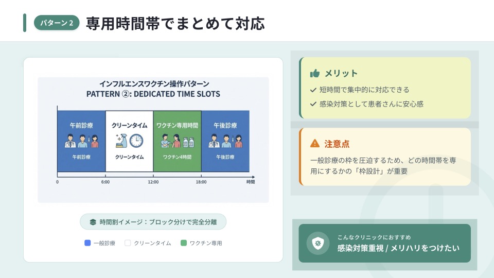 2つ目は、ワクチン接種専用の時間帯や曜日を設け、その枠でまとめて対応する方法です。