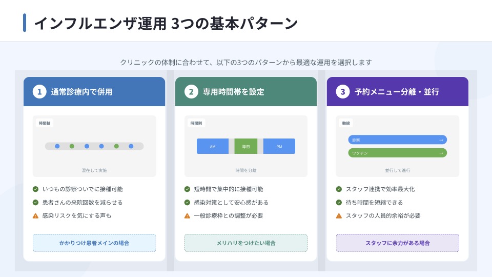 (1)インフルエンザワクチン運用は「通常診療内」「専用時間帯」「予約メニュー分離併用」の3パターンがある